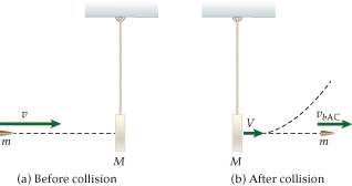 As shown in the figure below, a bullet is fired at and passes through a piece of target paper suspended by a massless string. The bullet has a mass m, a speed v before the collision with the target, and a speed (0.456)v