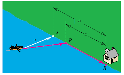 First figure out the distance from the boat to point P. Note this is the hypotenuse to the right triangle. A=2, and the base leg = (8-x), so using the Pythagorean theorem, you would get: